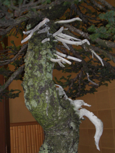 北国の豪雪強風に絶えぬいたエゾ松らしさを感じさせ、自然の厳しさに折られた枝は白骨化し生と死を感じさせる一品です。