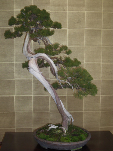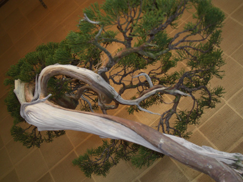 文人名木の真柏は抜群の葉性と白骨化した幹味を見せ枝々の空間に風を感じさせる一品です。