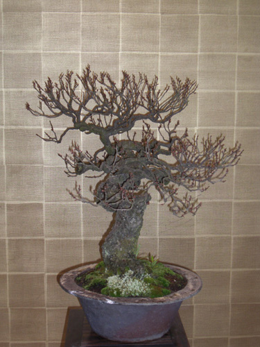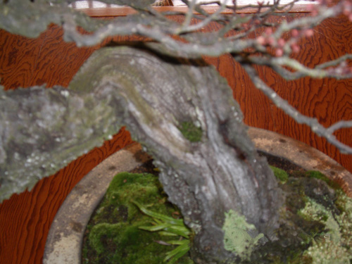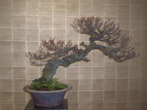花時期には、赤花の暖かさを感じさせる古緋梅斜幹の立ち上りのサバが梅らしさを演出し、ネジリながら伸びた幹は生命力を感じる一品です。
